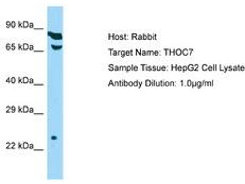 Synthetic peptide from C-Terminus of human THOC7 (Q6I9Y2, NP_079351). Percent identity by BLAST analysis: Human, Chimpanzee, Gorilla, Orangutan, Gibbon, Monkey, Galago, Marmoset, Rat, Elephant, Panda, Dog, Bovine, Rabbit, Horse, Pig, Opossum, Guinea pig, Platypus (100%), Turkey, Zebra finch, Chicken, Lizard (92%), Salmon, Pufferfish (91%), Mouse (85%), Xenopus (83%).