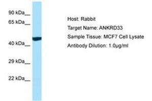 Synthetic peptide located between aa368-417 of human ANKRD33 (Q7Z3H0, NP_872414). Percent identity by BLAST analysis: Human, Chimpanzee, Gorilla, Orangutan, Monkey, Marmoset (100%), Gibbon, Galago (92%), Panda, Bovine (85%), Elephant (83%).