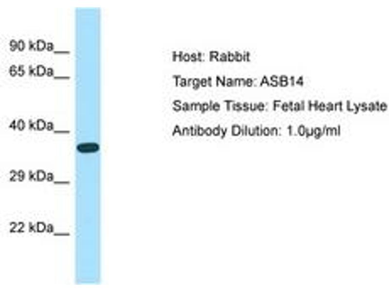 Synthetic peptide located between aa45-94 of human ASB14 (A6NK59, NP_569058). Percent identity by BLAST analysis: Human, Chimpanzee, Gorilla, Gibbon (100%), Orangutan, Panda, Dog, Bovine (92%), Monkey, Galago, Mouse, Bat, Rabbit, Guinea pig (85%), Rat (78%).