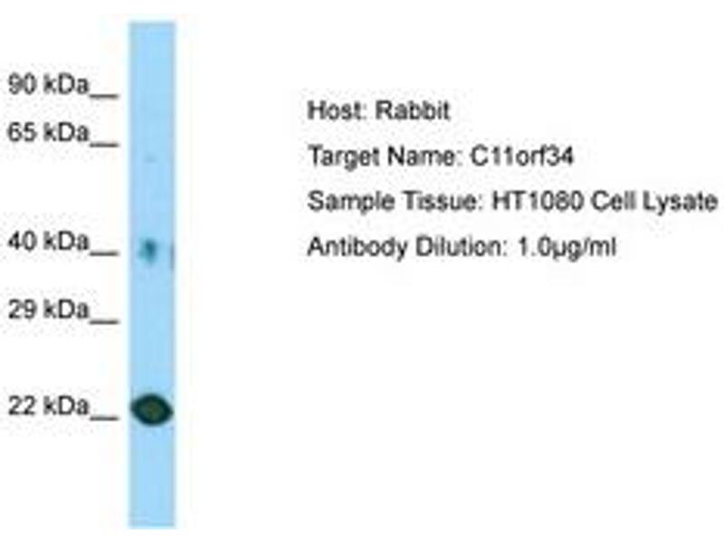 Synthetic peptide located between aa81-130 of human C11orf34 (Q6UQ28, NP_001138496). Percent identity by BLAST analysis: Human, Chimpanzee (100%).