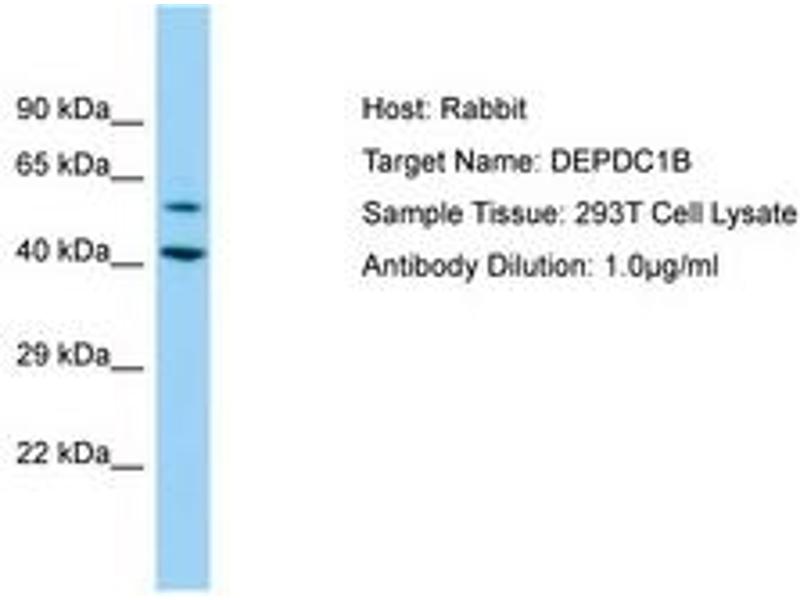 Synthetic peptide located between aa87-136 of human DEPDC1B (Q8WUY9, NP_060839). Percent identity by BLAST analysis: Human (100%), Chimpanzee, Gorilla, Orangutan, Monkey, Rat, Horse (92%), Gibbon, Dog, Rabbit, Guinea pig (85%), Bovine (84%), Mouse (78%).