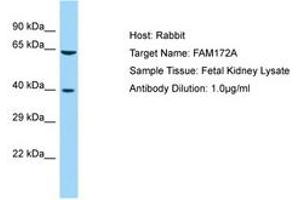 Synthetic peptide located between aa170-219 of human FAM172A (NP_001156889). Percent identity by BLAST analysis: Human, Chimpanzee, Gorilla, Orangutan, Gibbon, Monkey, Galago, Marmoset, Rat, Dog, Bat, Rabbit, Horse (100%), Mouse, Elephant, Panda (92%), Zebra finch, Chicken, Platypus (85%).