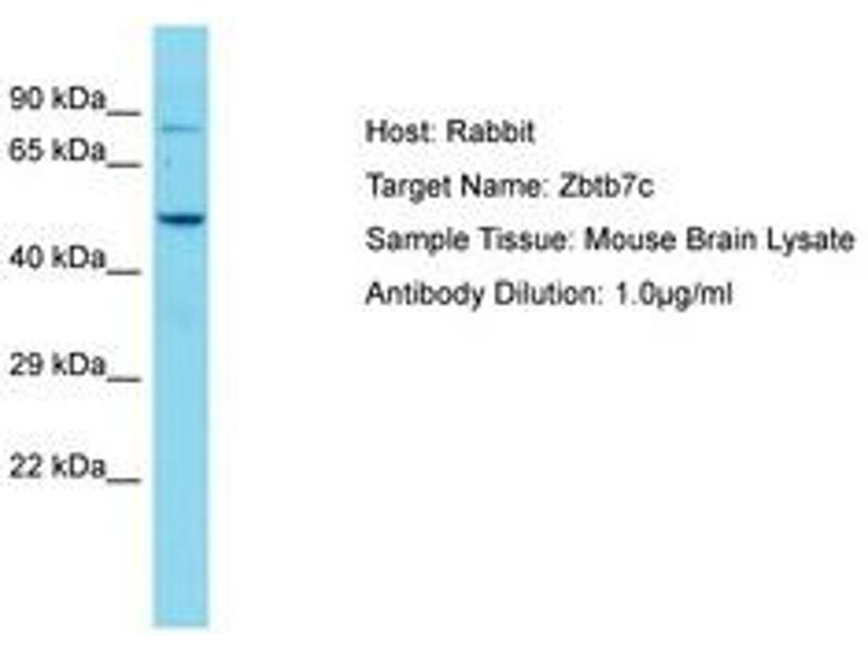 Synthetic peptide located between aa181-230 of mouse Zbtb7c (Q8VCZ7, NP_663331). Percent identity by BLAST analysis: Mouse (100%).