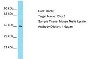 Synthetic peptide from N-Terminus of mouse Rhox8 (Q6VSS7, NP_001004193). Percent identity by BLAST analysis: Mouse (100%).