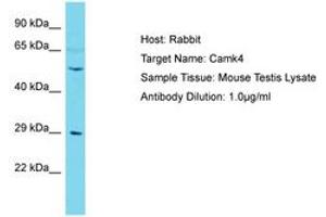 Synthetic peptide located between aa363-412 of mouse Camk4 (Q8BGR3, NP_033923). Percent identity by BLAST analysis: Mouse (100%).