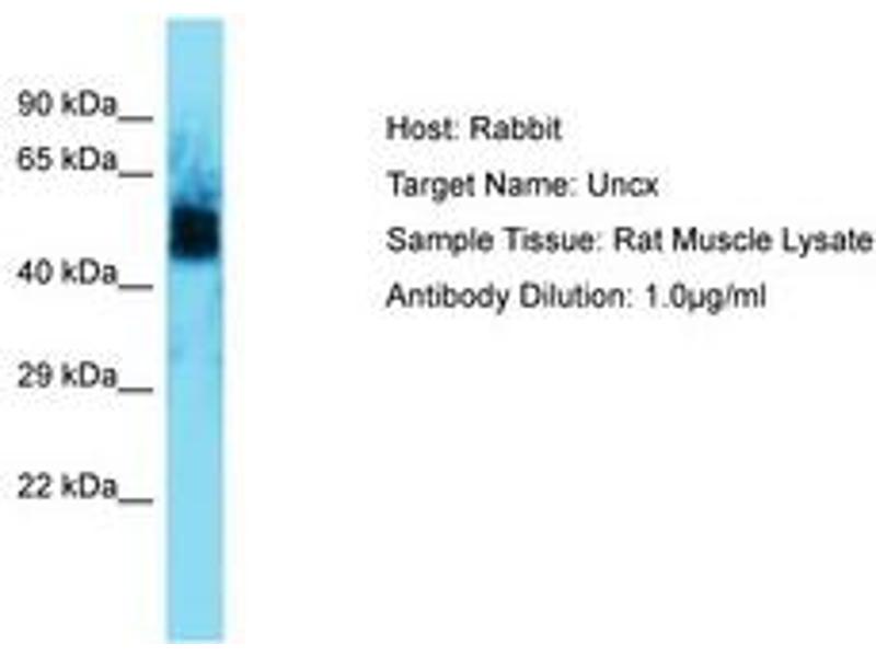Synthetic peptide located between aa72-121 of rat Uncx (P97830, NP_058875). Percent identity by BLAST analysis: Mouse, Rat (100%).