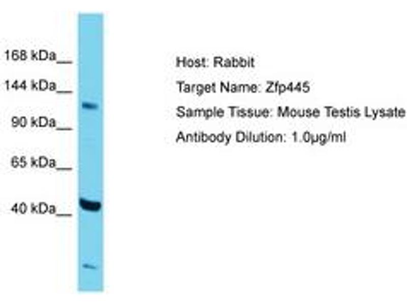 Synthetic peptide located between aa406-455 of mouse Zfp445 (Q8R2V3, NP_775540). Percent identity by BLAST analysis: Mouse (100%).