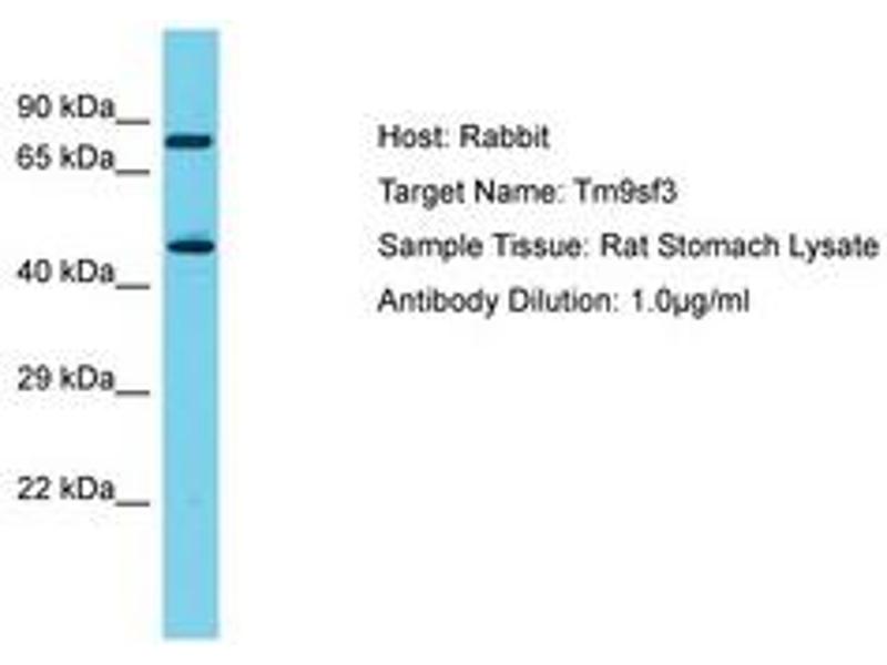 Synthetic peptide located between aa187-236 of rat Tm9sf3 (D3ZUD8). Percent identity by BLAST analysis: Human, Chimpanzee, Mouse, Rat, Bovine, Rabbit, Horse, Pig, Guinea pig, Chicken (100%).