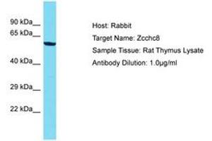 Synthetic peptide located between aa246-295 of rat Zcchc8 (NP_001099399). Percent identity by BLAST analysis: Rat (100%).