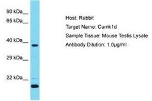 Synthetic peptide located between aa39-88 of mouse Camk1d (NP_796317). Percent identity by BLAST analysis: Human, Chimpanzee, Mouse, Rat, Rabbit, Guinea pig (100%).
