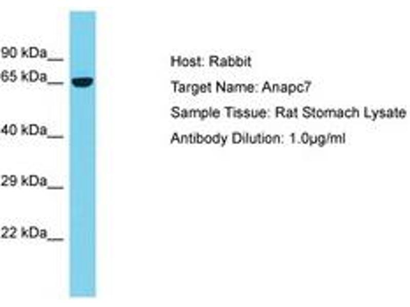 Synthetic peptide located between aa387-436 of rat Anapc7 (D3ZIT4, NP_001100612). Percent identity by BLAST analysis: Mouse, Rat, Guinea pig (100%).