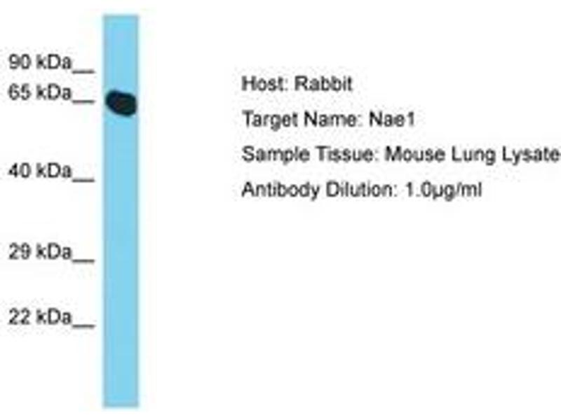 Synthetic peptide located between aa308-357 of mouse Nae1 (Q8VBW6, NP_659180). Percent identity by BLAST analysis: Mouse, Rat (100%).