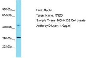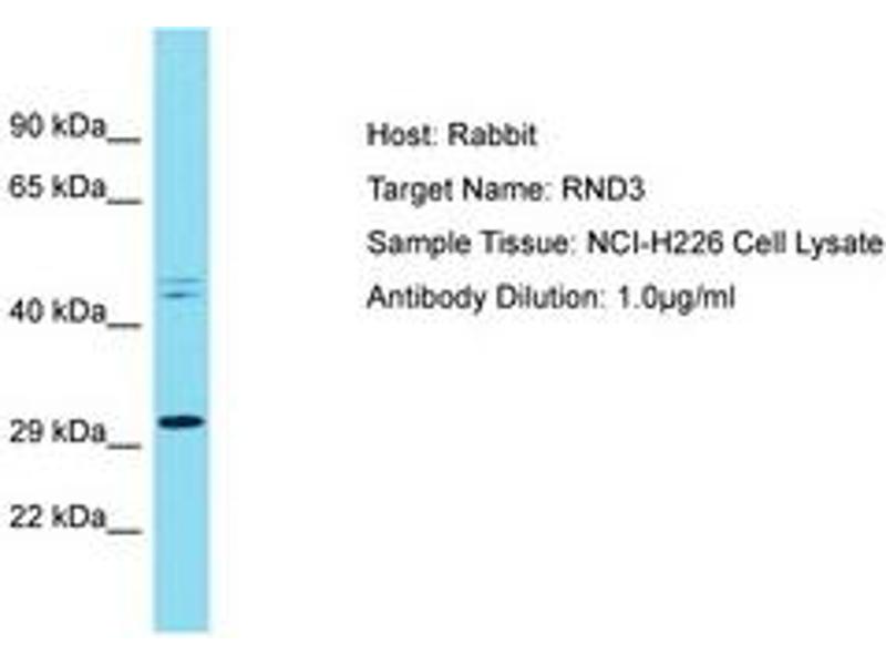 Synthetic peptide from C-Terminus of human RND3 (P61587, NP_005159). Percent identity by BLAST analysis: Human, Chimpanzee, Mouse, Rat, Bovine, Rabbit, Horse, Pig, Guinea pig (100%).
