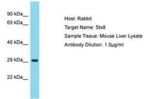 Synthetic peptide located between aa161-210 of mouse Stx8 (O88983, NP_061238). Percent identity by BLAST analysis: Mouse, Rat (100%).