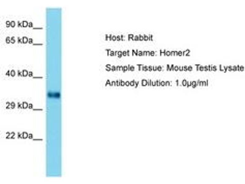 Synthetic peptide located between aa153-202 of mouse Homer2 (E9Q4F9, NP_001157559). Percent identity by BLAST analysis: Mouse (100%).