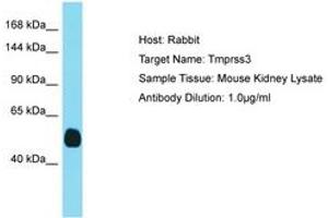 Synthetic peptide located between aa401-450 of mouse Tmprss3 (Q3TZ06, NP_001157248). Percent identity by BLAST analysis: Chimpanzee, Mouse, Rat (100%).