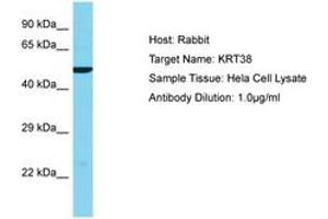Synthetic peptide located between aa206-255 of human KRT38 (O76015, NP_006762). Percent identity by BLAST analysis: Human, Chimpanzee (100%).