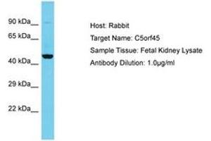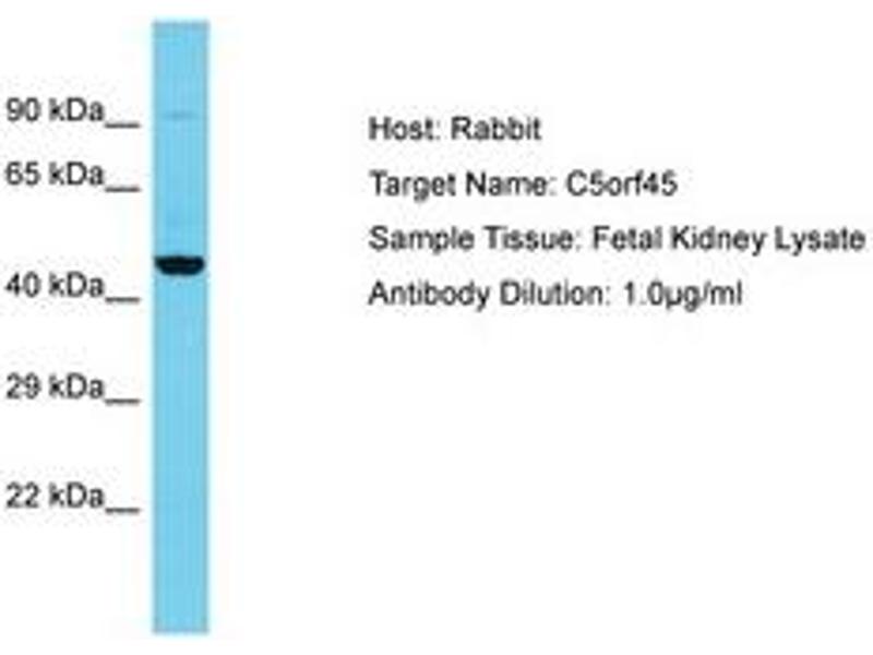 Synthetic peptide located between aa63-112 of human C5orf45 (Q6NTE8, NP_057259). Percent identity by BLAST analysis: Human, Chimpanzee (100%).