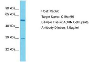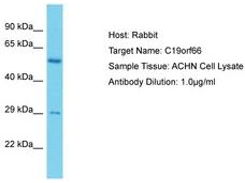 Synthetic peptide located between aa35-84 of human C19orf66 (Q9NUL5, NP_060851). Percent identity by BLAST analysis: Human, Chimpanzee, Rabbit, Pig (100%).
