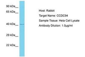 Synthetic peptide located between aa239-288 of human CCDC94 (Q9BW85, NP_060544). Percent identity by BLAST analysis: Human (100%).