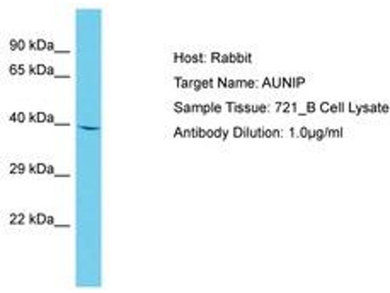 Synthetic peptide located between aa54-103 of human AUNIP (Q9H7T9, NP_076942). Percent identity by BLAST analysis: Human, Chimpanzee (100%).