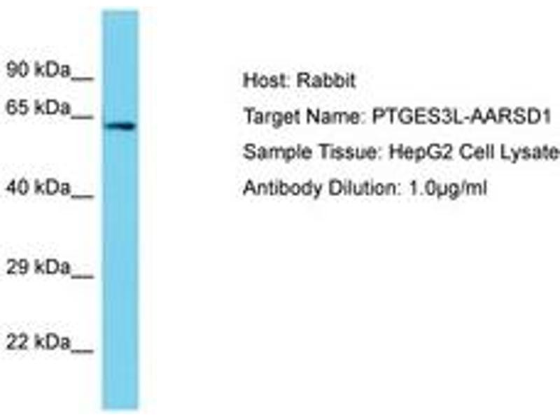 Synthetic peptide located between aa452-501 of human PTGES3L-AARSD1 (Q9BTE6-2, NP_079543). Percent identity by BLAST analysis: Human (100%).