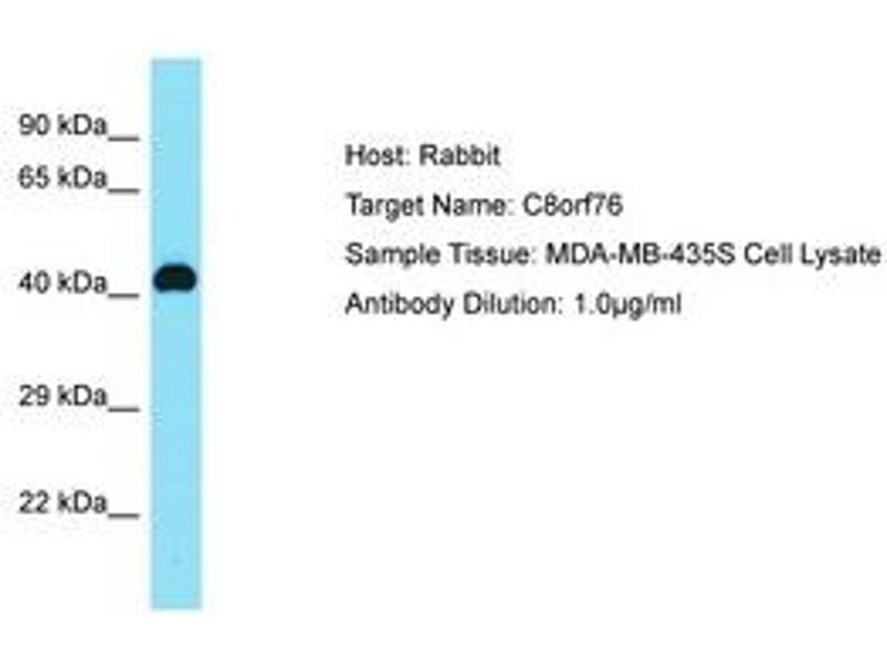 Synthetic peptide located between aa61-110 of human C8orf76 (Q96K31, NP_116236). Percent identity by BLAST analysis: Human (100%).