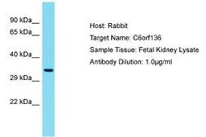 Synthetic peptide located between aa220-269 of human C6orf136 (Q5SQH8, NP_001103408). Percent identity by BLAST analysis: Human, Chimpanzee (100%).