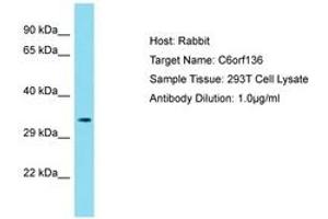Synthetic peptide located between aa116-165 of human C6orf136 (Q5SQH8, NP_001103408). Percent identity by BLAST analysis: Human, Chimpanzee (100%).