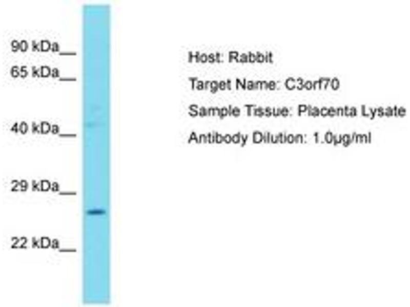 Synthetic peptide located between aa170-219 of human C3orf70 (A6NLC5, NP_001020437). Percent identity by BLAST analysis: Human, Chimpanzee, Bovine, Horse (100%).