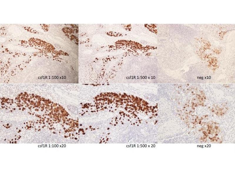 - The CSF1R antibody ABIN683788 specifically labels the targeted antigen in canine lymph node samples in IHC.