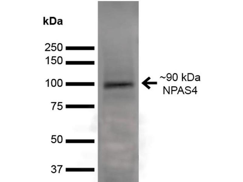A 1:100 dilution of ABIN6932481 was sufficient for detection of NPAS4 in 20 μg of mouse brain lysate by ECL immunoblot analysis using Goat anti-mouse IgG:HRP as the secondary antibody.