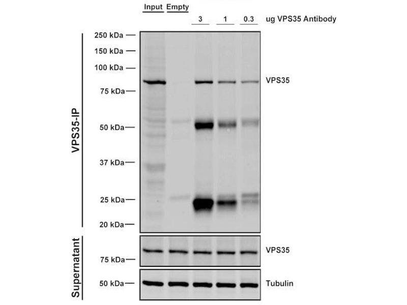 A 1:1000 dilution of ABIN6932953 was sufficient for detection of VPS35 in 10 μg of SH-SY5Y by ECL immunoblot analysis using Goat Anti-Mouse IgG:HRP as the secondary antibody.