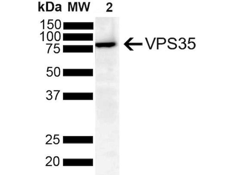 A 1:1000 dilution of ABIN6932968 was sufficient for detection of VPS35 in 10 μg of SH-SY5Y by ECL immunoblot analysis using Goat Anti-Mouse IgG:HRP as the secondary antibody.