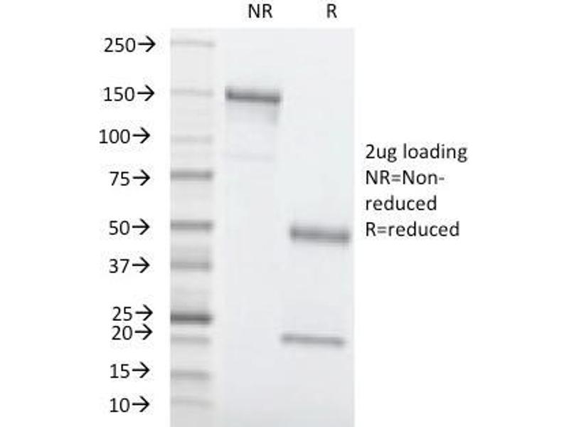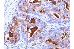 This antibody recognizes proteins of 80-200 kDa, identified as different members of CEA family. CEA is synthesized during development in the fetal gut and is re-expressed in increased amounts in intestinal carcinomas and several other tumors. This MAb reacts with nonspecific cross-reacting antigen (NCA). It shows no reaction with a variety of normal tissues and is suitable for staining of formalin/paraffin tissues. CEA is not found in benign glands, stroma, or malignant prostatic cells. Antibody to CEA is useful in detecting early foci of gastric carcinoma and in distinguishing pulmonary adenocarcinomas (60-70 % are CEA+) from pleural mesotheliomas (rarely or weakly CEA+). Anti-CEA positivity is seen in adenocarcinomas from the lung, colon, stomach, esophagus, pancreas, gallbadder, urachus, salivary gland, ovary, and endocervix.