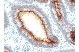- This antibody recognizes proteins of 80-200 kDa, identified as different members of CEA family. CEA is synthesized during development in the fetal gut and is re-expressed in increased amounts in intestinal carcinomas and several other tumors. This MAb does not react with nonspecific cross-reacting antigen (NCA) and with human polymorphonuclear leucocytes. It shows no reaction with a variety of normal tissues and is suitable for staining of formalin/paraffin tissues. CEA is not found in benign glands, stroma, or malignant prostatic cells. Antibody to CEA is useful in detecting early foci of gastric carcinoma and in distinguishing pulmonary adenocarcinomas (60-70 % are CEA+) from pleural mesotheliomas (rarely or weakly CEA+). Anti-CEA positivity is seen in adenocarcinomas from the lung, colon, stomach, esophagus, pancreas, gallbadder, urachus, salivary gland, ovary, and endocervix.