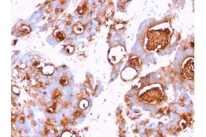 - This antibody recognizes proteins of 80-200 kDa, identified as different members of CEA family. CEA is synthesized during development in the fetal gut and is re-expressed in increased amounts in intestinal carcinomas and several other tumors. This MAb does not react with nonspecific cross-reacting antigen (NCA) and with human polymorphonuclear leucocytes. It shows no reaction with a variety of normal tissues and is suitable for staining of formalin/paraffin tissues. CEA is not found in benign glands, stroma, or malignant prostatic cells. Antibody to CEA is useful in detecting early foci of gastric carcinoma and in distinguishing pulmonary adenocarcinomas (60-70 % are CEA+) from pleural mesotheliomas (rarely or weakly CEA+). Anti-CEA positivity is seen in adenocarcinomas from the lung, colon, stomach, esophagus, pancreas, gallbadder, urachus, salivary gland, ovary, and endocervix.