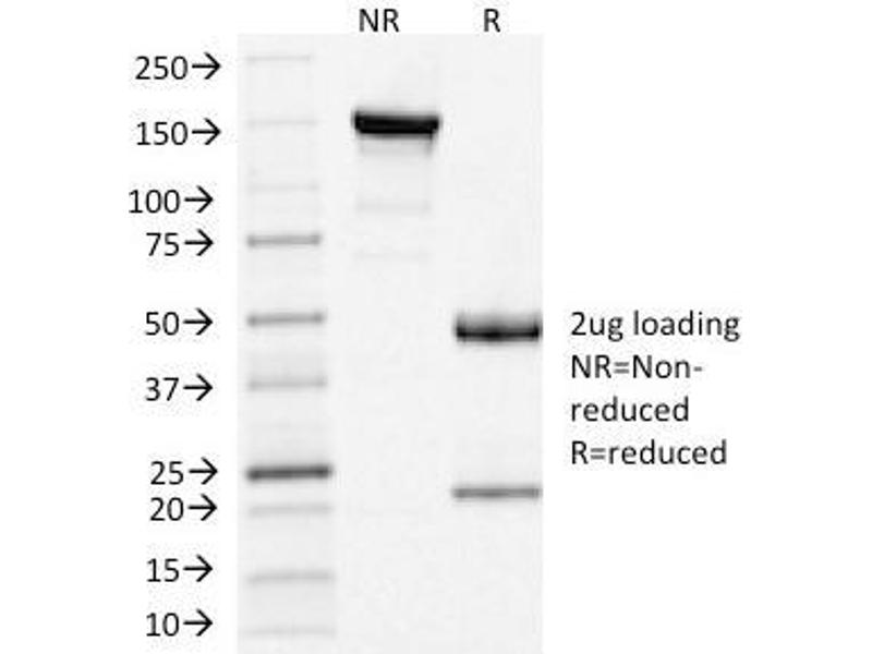 Known Application: Immunohistochemistry (Formalin-fixed) (0.5-1 μg/mL for 30 min at RT)(Staining of formalin-fixed tissues requires boiling tissue sections in 10 mM Citrate Buffer, pH 6.0, for 10-20 min followed by cooling at RT for 20 minutes)Optimal dilution for a specific application should be determined.