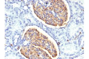 Known Application: Immunohistochemistry (Formalin-fixed) (1-2 μg/mL for 30 min at RT)(Staining of formalin-fixed tissues requires boiling tissue sections in 10 mM Citrate Buffer, pH 6.0, for 10-20 min followed by cooling at RT for 20 minutes)Optimal dilution for a specific application should be determined.