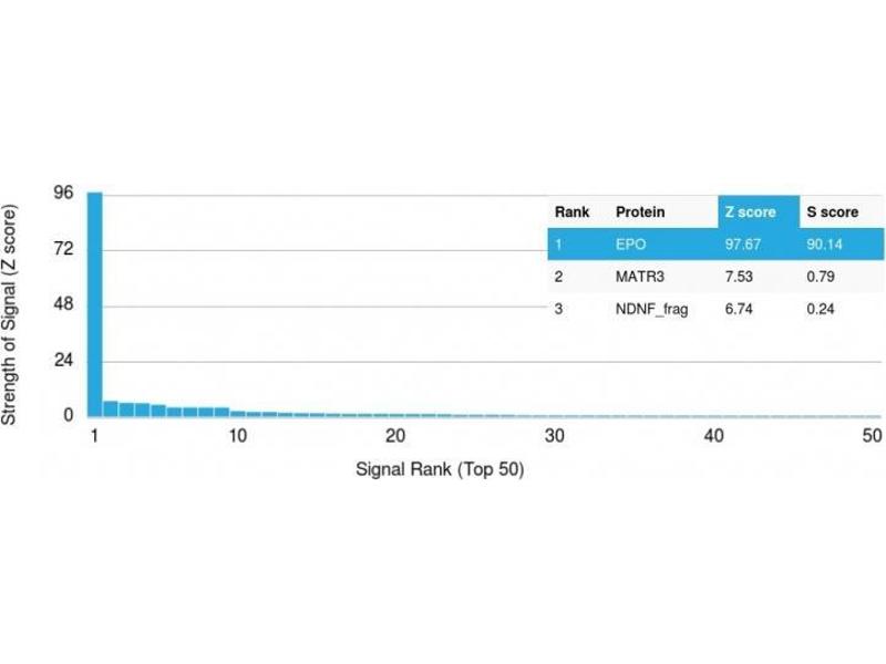 - Recognizes a protein of about 37 kDa, which is identified as Erythropoietin (EPO). Erythropoietin is a secreted, glycosylated cytokine hormone composed of four alpha helical bundles. It is the primary factor responsible for regulating erythropoiesis during steady-state conditions and in response to blood loss and hemorrhage in the adult organism. Erythropoietin is synthesized by the kidney and stimulates the proliferation and maturation of bone marrow erythroid precursor cells. The protein is found in the plasma and regulates red cell production by promoting erythroid differentiation and initiating hemoglobin synthesis.