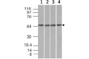 Known Application: Western Blot (1-2 μg/mL for 60 minutes at RT),Immunohistochemistry (Formalin-fixed) (1-2 μg/mL for 30 minutes at RT)(Staining of formalin-fixed tissues requires boiling tissue sections in 10 mM Citrate buffer, pH 6.0 for 10-20 min followed by cooling at RT for 20 minutes)Optimal dilution for a specific application should be determined.