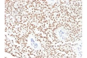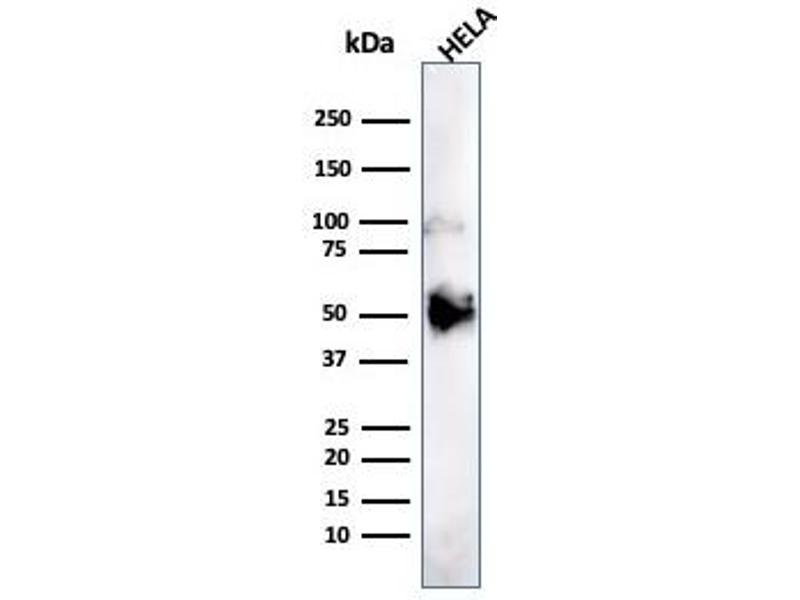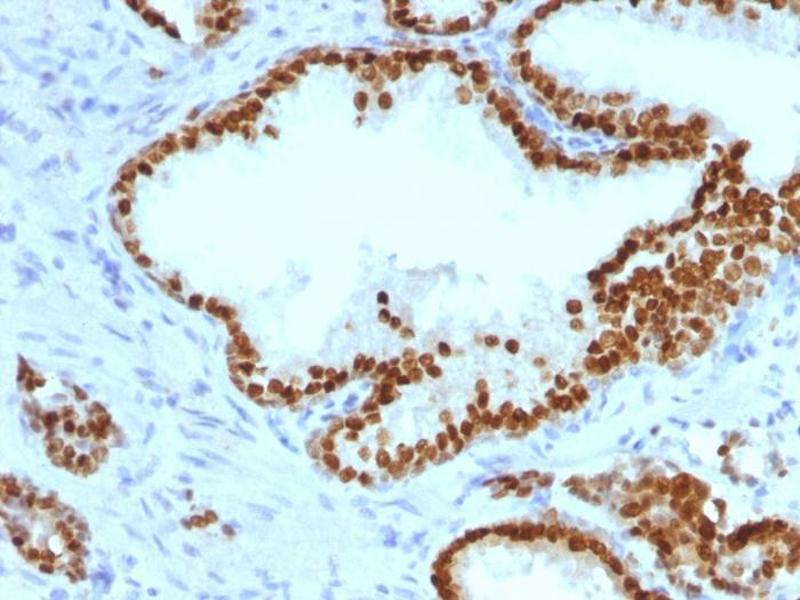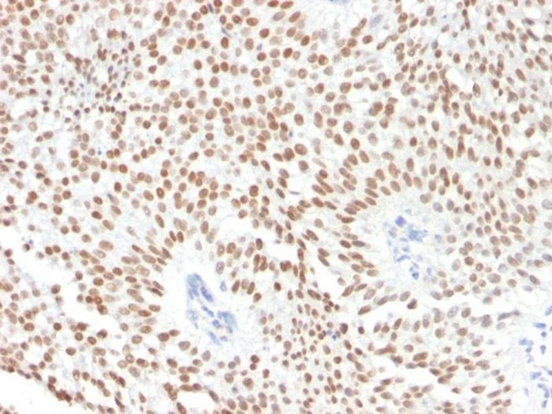 Known Application: Immunohistochemistry (Formalin-fixed) (0.5-1.0 μg/mL for 30 minutes at RT)(Staining of formalin-fixed tissues is enhanced by boiling tissue sections in 10 mM Tris with 1 mM EDTA, pH 9.0 for 10-20 min followed by cooling at RT for 20 minutes)Optimal dilution for a specific application should be determined.