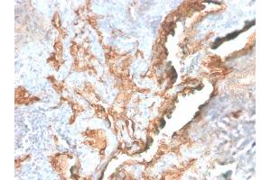 Positive Control: Extracellular matrix in tonsil and blood vessels. Stroma of many tumors such as breast, squamous cell and lung carcinomas. Staining of normal fibroblasts serves as internal positive control.