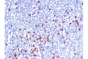 - Recognizes a protein of 75 kDa, identified as gamma heavy chain of human immunoglobulins. It does not cross-react with alpha (IgA), mu (IgM), epsilon (IgE), or delta (IgD), heavy chains, T-cells, monocytes, granulocytes, or erythrocytes. This MAb is useful in the identification of leukemias, plasmacytomas, and certain non-Hodgkin's lymphomas. The most common feature of these malignancies is the restricted expression of a single heavy chain class. Demonstration of clonality in lymphoid infiltrates indicates that the infiltrate is clonal and therefore malignant.