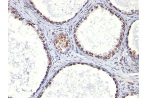 - Recognizes a protein of 110 kDa, which is identified as androgen receptor (AR). It reacts with full length, and the newly described A form of the receptor. It does not cross react with estrogen, progesterone, or glucocorticoid receptors. The expression of AR is reportedly inversely correlated with histologic grade i.e. well differentiated prostate tumors show higher expression than the poorly differentiated tumors. In prostate cancer, AR has been proposed, as a marker of hormone-responsiveness and thus it may be useful in identifying patients likely to benefit from anti-androgen therapy. Anti-androgen receptor has been useful clinically in differentiating morpheaform basal cell carcinoma (mBCC) from desmoplastic trichoepithelioma (DTE) in the skin.This MAb is superb for staining of formalin/paraffin tissues.