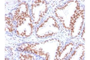 - Recognizes a protein of 110 kDa, which is identified as androgen receptor (AR). It reacts with full length, and the newly described A form of the receptor. It does not cross react with estrogen, progesterone, or glucocorticoid receptors. The expression of AR is reportedly inversely correlated with histologic grade i.e. well differentiated prostate tumors show higher expression than the poorly differentiated tumors. In prostate cancer, AR has been proposed, as a marker of hormone-responsiveness and thus it may be useful in identifying patients likely to benefit from anti-androgen therapy. Anti-androgen receptor has been useful clinically in differentiating morpheaform basal cell carcinoma (mBCC) from desmoplastic trichoepithelioma (DTE) in the skin.This MAb is superb for staining of formalin/paraffin tissues.