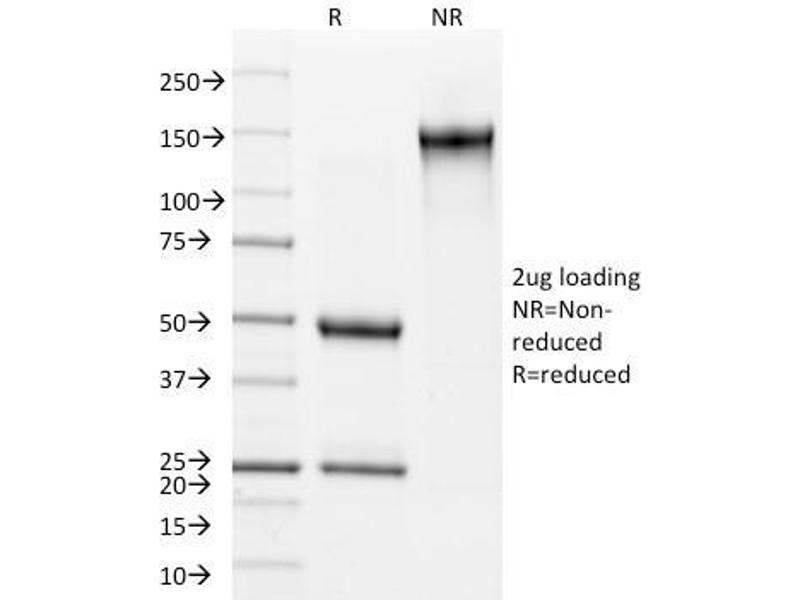 Known Application: Immunohistochemistry (Formalin-fixed) (0.1-0.2 μg/mL for 30 min at RT)(Staining of formalin-fixed tissues is enhanced by digestion with trypsin or Protease XXV at 1 mg/mL PBS for 5 min at 37'C)(Note than enzyme digestion is better than citrate buffer based epitope unmasking)Optimal dilution for a specific application should be determined.