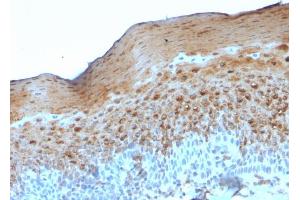 Positive Control: MCF-7 cells. Localized to upper spinous and granular layers in normal skin.