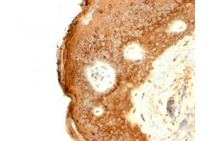 Positive Control: MCF-7 cells. Localized to upper spinous and granular layers in normal skin.