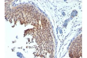 Positive Control: RAW, HeLa, Suprabasal cells of the outer hair follicle root sheath in skin. Basal cell carcinoma.
